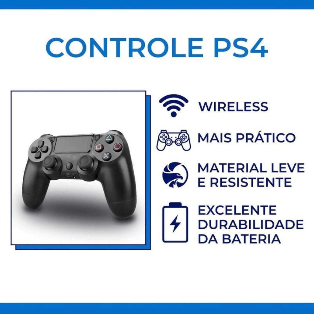 Este controle para ps4 possui alta precisão com analógicos e botões macios, possui função vibrar, além disso não possui fio o que te garante mais liberdade enquanto joga, este controle possui também uma bateria interna recarregável, a bateria é recarregada usando um cabo USB (incluso), e você pode continuar jogando normalmente enquanto carrega